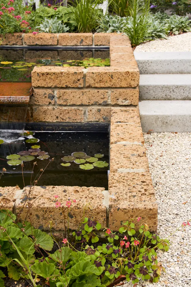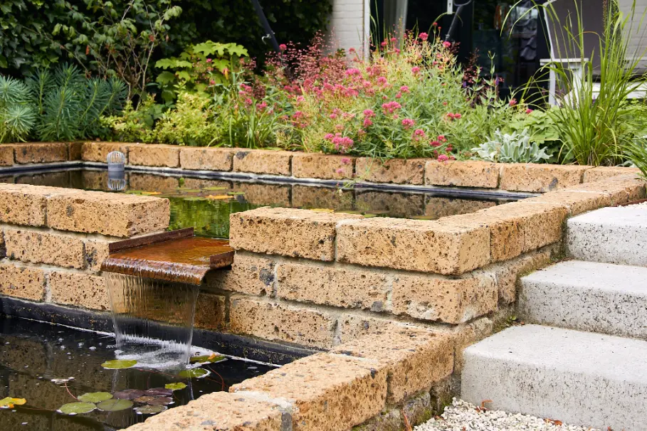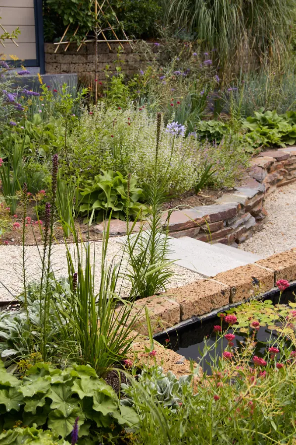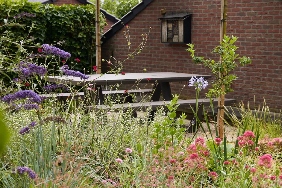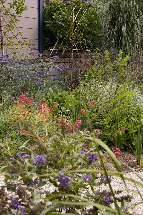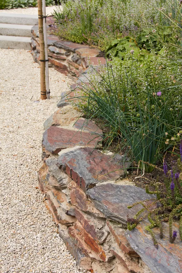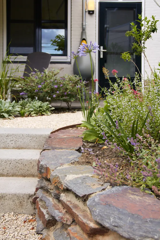 Daarna is de tuin aangelegd met een robuuste en sfeervolle mix van materialen. Het stapelmuurtje van ruwe natuurstenen flagstones vormt een warme, natuurlijke tegenhanger van de strakke trapdelen en geeft extra diepte aan de borders. De beplanting is rijk en eetbaar opgezet met veel variatie in soorten, bloei en structuur, waardoor de tuin het hele seizoen iets te bieden heeft en mooi meegroeit met het gebruik.