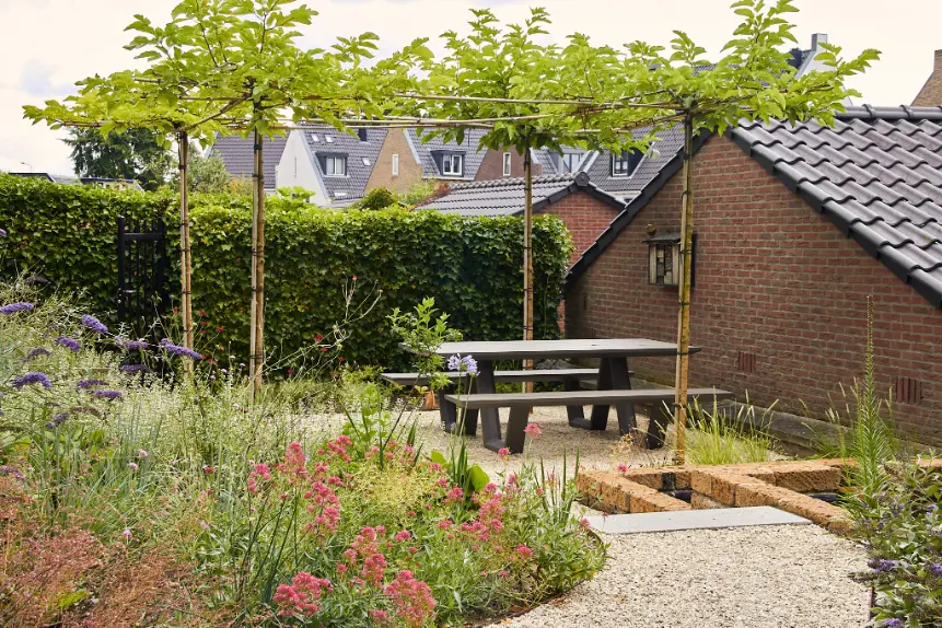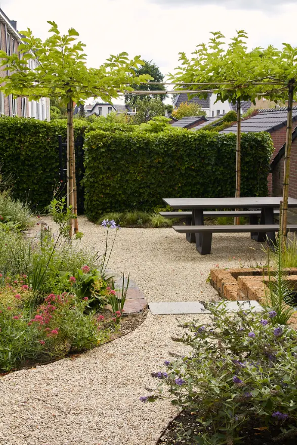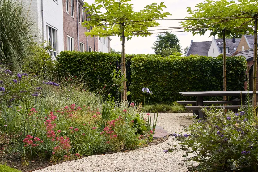 Voor deze tuin hebben we een ontwerp gemaakt waarin materiaalkeuze en beplanting samen de uitstraling bepalen. Er is gekozen voor een heldere, moderne structuur met strakke elementen, zoals de Schellevis trapdelen die gebruikt zijn voor paden en hoogteverschillen. Tegelijkertijd hebben we organische vormen toegevoegd om de tuin zachter en natuurlijker te laten aanvoelen, zodat het geheel in balans blijft.