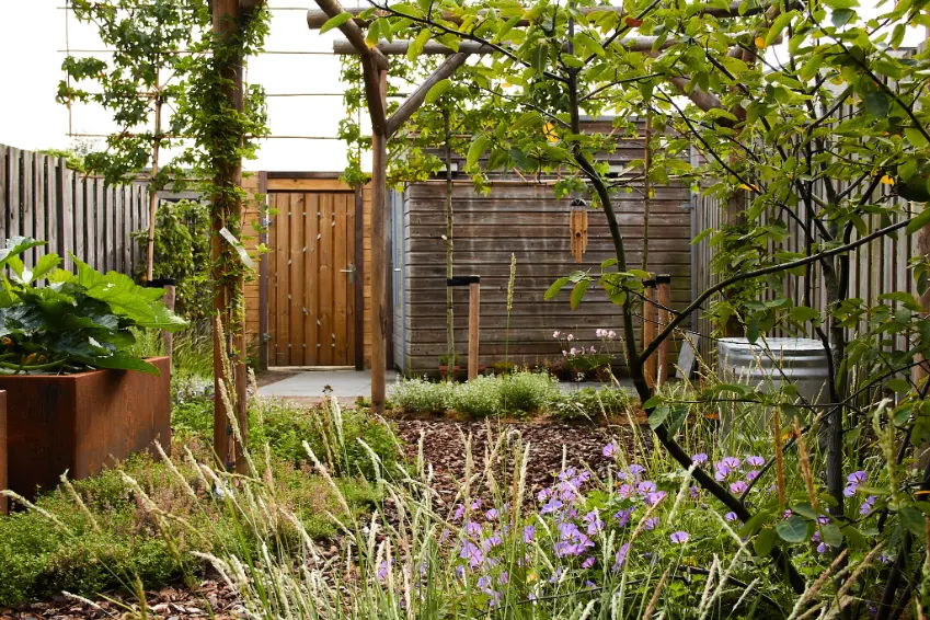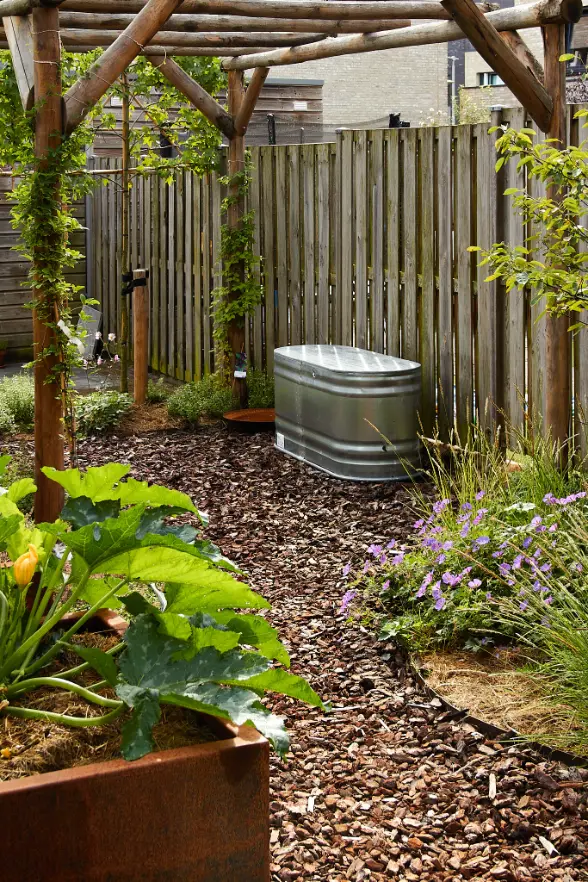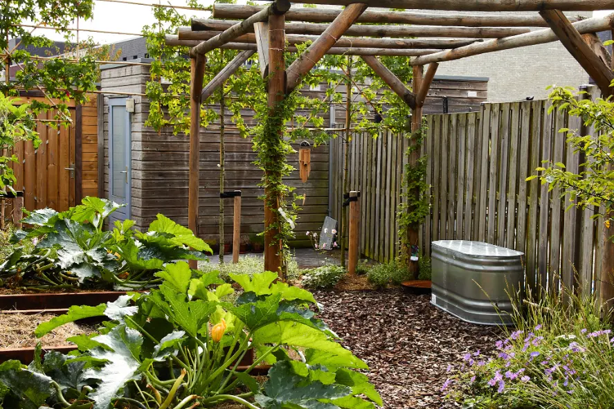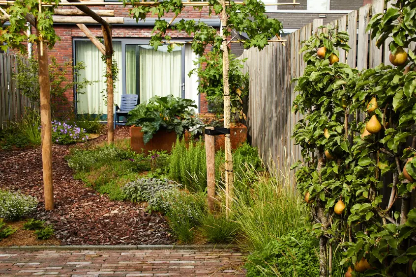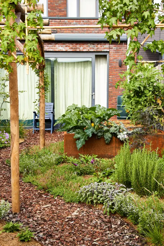 Daarna hebben we de beplanting en aanleg verzorgd. Er zijn verhoogde cortenstalen bakken geplaatst voor groente en kruiden, aangevuld met een pergola met klimplanten voor verticale groei en beschutting. Langs de randen en tegen de schutting is gewerkt met een mix van eetbare vaste planten, siergrassen en bodembedekkers, en er zijn fruitbomen toegevoegd die tegelijk structuur geven en opbrengst leveren. Alles is aangeplant met oog voor biodiversiteit en seizoensbeleving.