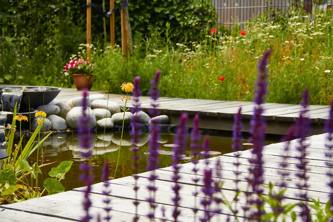 Voor deze tuin hebben we een ontwerp gemaakt waarin een rustige basis en een natuurlijke uitstraling elkaar versterken. We legden duidelijke loop- en verblijfsroutes aan en kozen voor een strakke houten vlonder als centraal element in de tuin. Rondom de vlonder is ruimte gecreëerd om te zitten en te genieten van het water en het groen, terwijl de rest van de tuin juist losser en wilder mocht aanvoelen.