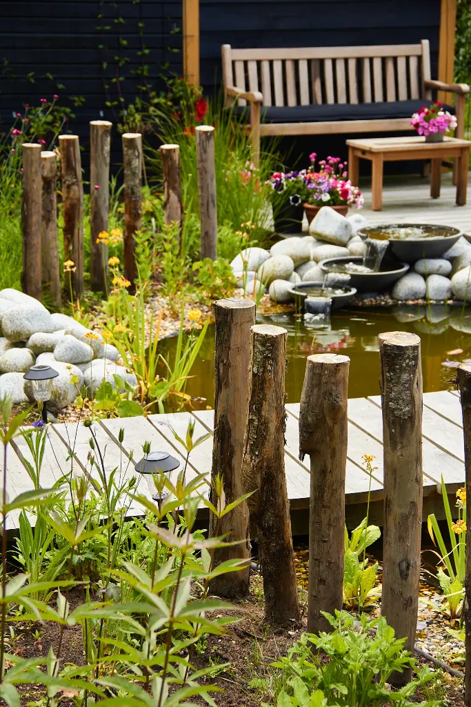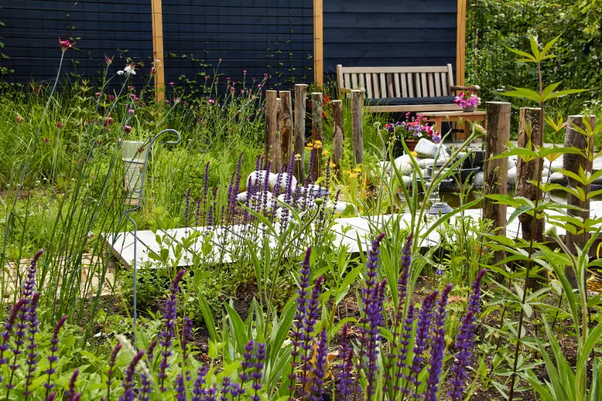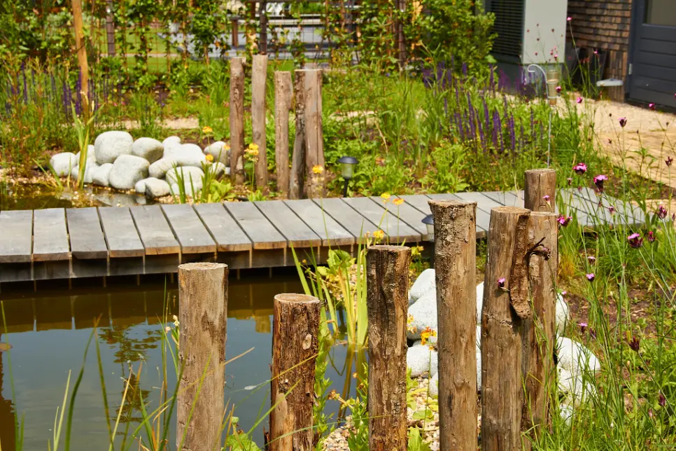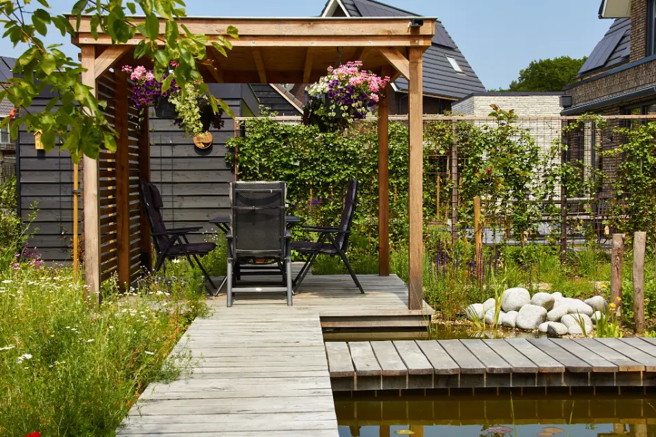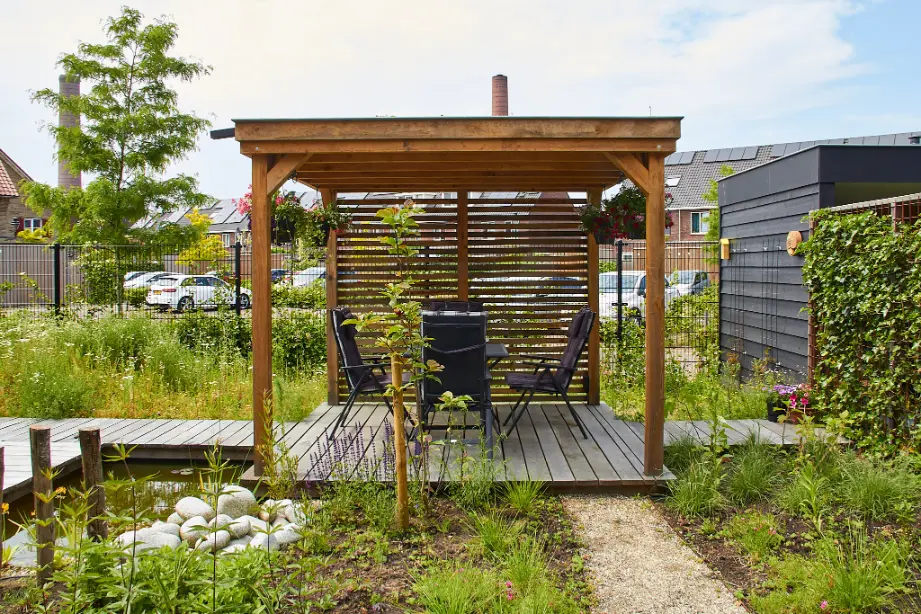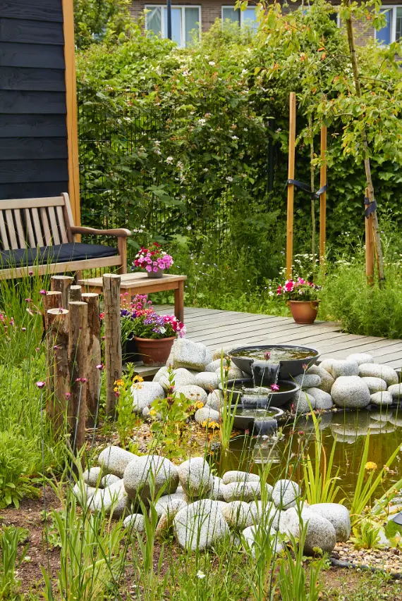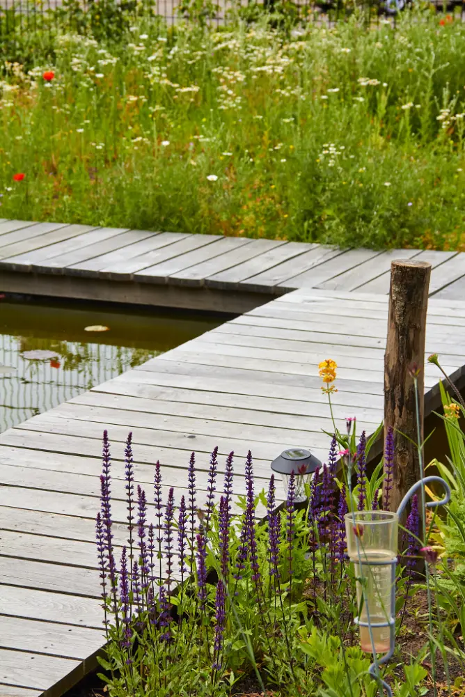 Daarna hebben we de tuin aangelegd en beplant met een rijke mix van bijvriendelijke en natuurlijke soorten. De vijver is speels gevormd en afgewerkt met natuurlijke oevers en keien, zodat het water mooi opgaat in het geheel. De beplanting bestaat uit luchtige vaste planten, siergrassen en bloemrijke stukken die veel insecten aantrekken en door het seizoen heen blijven veranderen. Zo ontstaat een tuin met structuur, maar ook met volop leven.