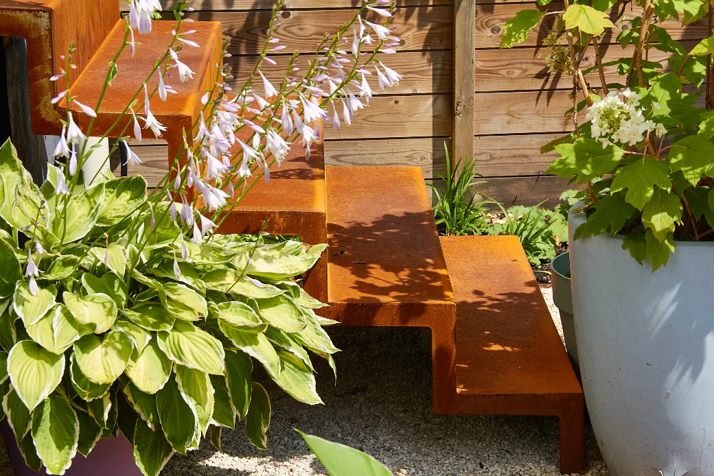 Om de tuin karakter en samenhang te geven, hebben we gewerkt met een mix van materialen. Cortenstaal accenten zoals randen en traptredes zorgen voor een moderne touch en maken hoogteverschillen subtiel maar zichtbaar. Dit hebben we gecombineerd met warme houten elementen en een beplanting die de tuin zacht maakt, met bloei, bladstructuren en klimplanten langs de schutting voor extra groen en privacy.