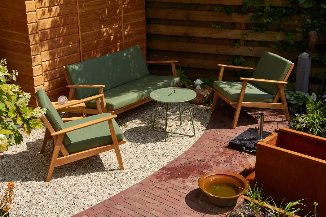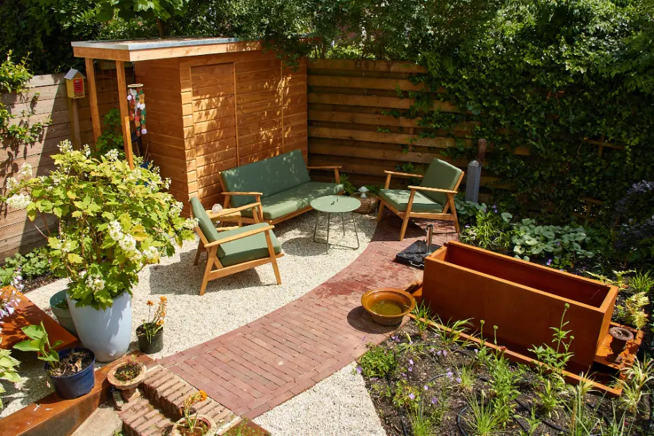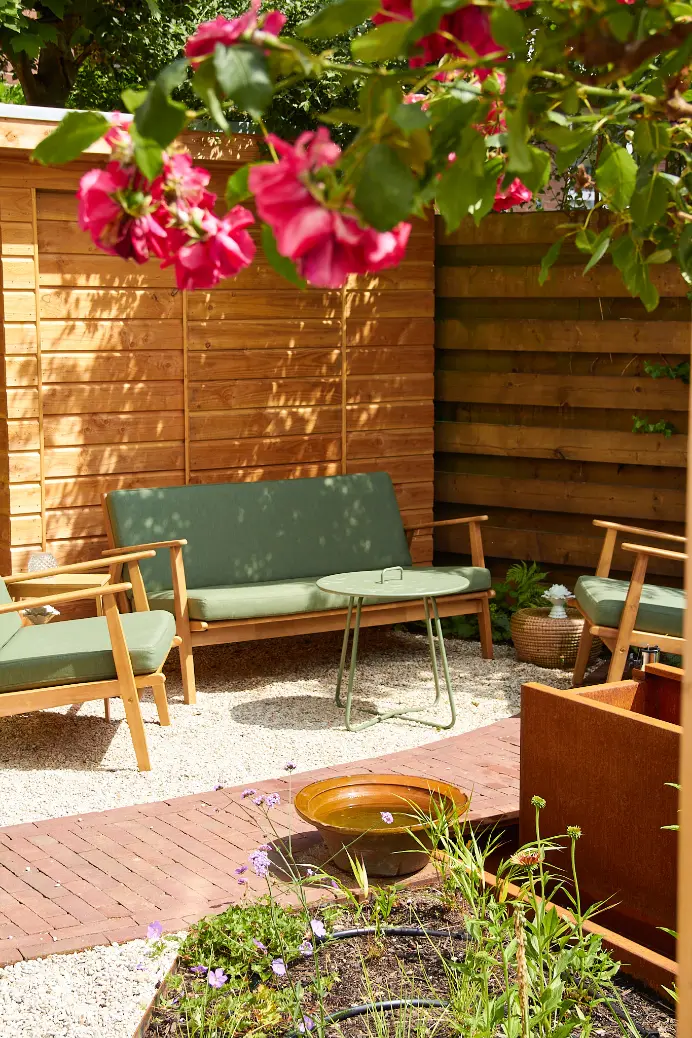 We hebben de tuin opnieuw ingedeeld om in een beperkte ruimte toch verschillende functies te maken. Er is een duidelijke route aangelegd met een speels gebogen pad van gebakken klinkers, dat de tuin optisch verlengt. Daarnaast hebben we een zithoek gecreëerd op halfverharding, beschut en prettig in de zon, zodat je hier echt een extra buitenkamer hebt.