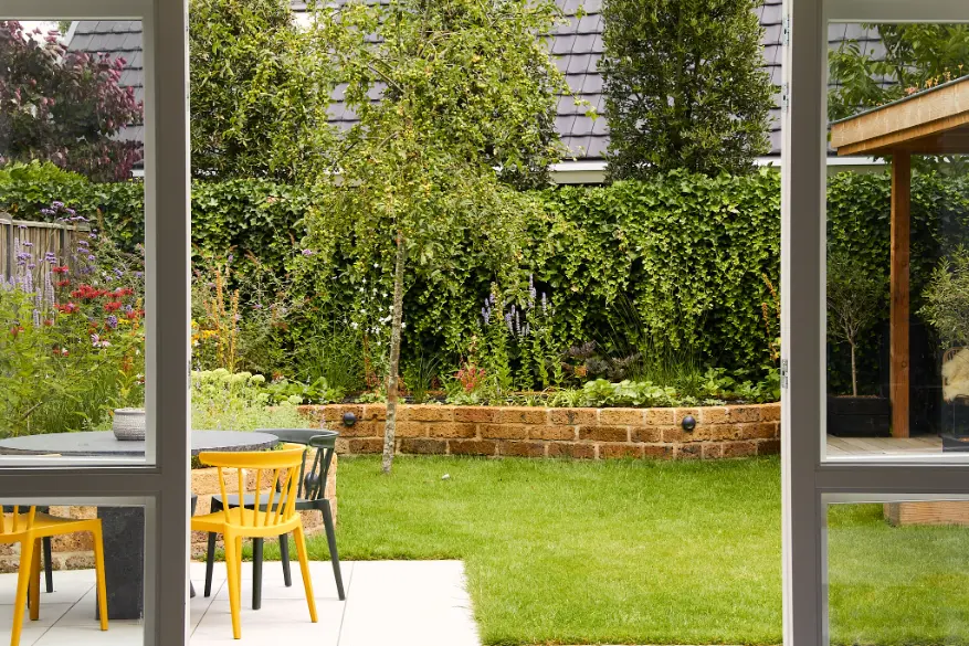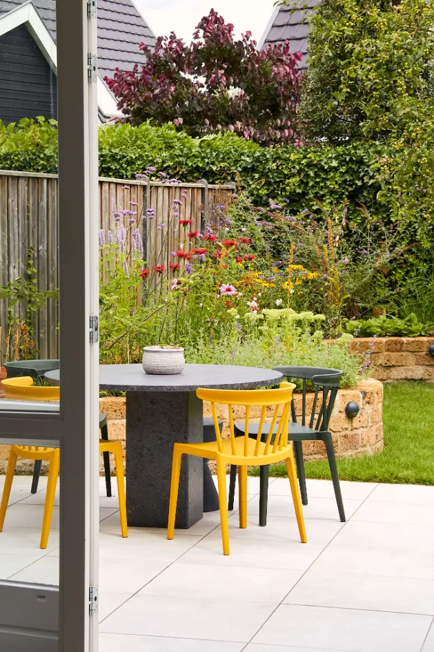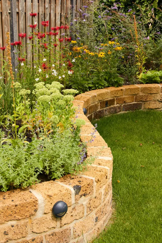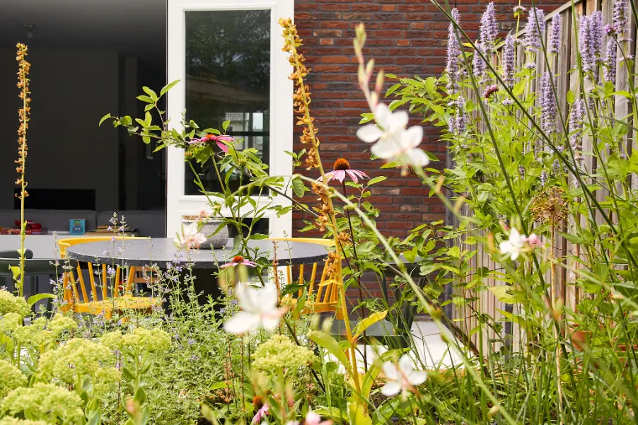 Daarna is de tuin volledig aangelegd en beplant. We hebben verhoogde, ronde borders gemetseld die de kleurrijke beplanting als het ware omlijsten. In de borders is gekozen voor een speelse combinatie van vaste planten en siergrassen die bloeien van voorjaar tot nazomer en ook in de winter mooi blijven. Daarnaast is een comfortabele houten overkapping geplaatst als extra zitplek, met een groen sedumdak dat de tuin nog meer natuurlijk karakter geeft.