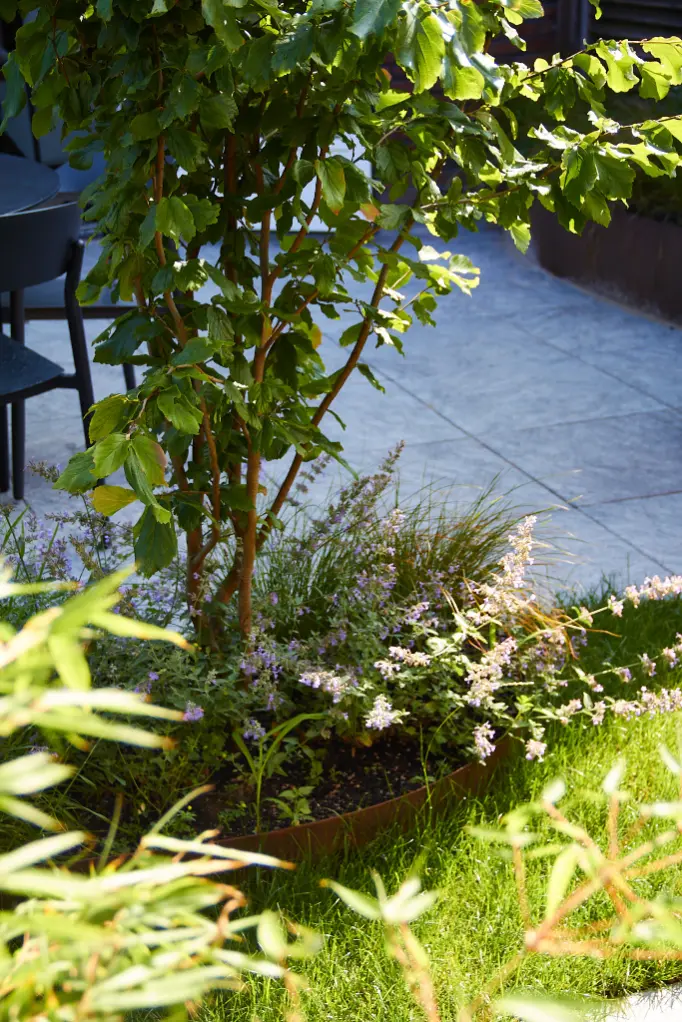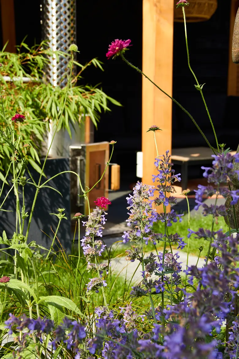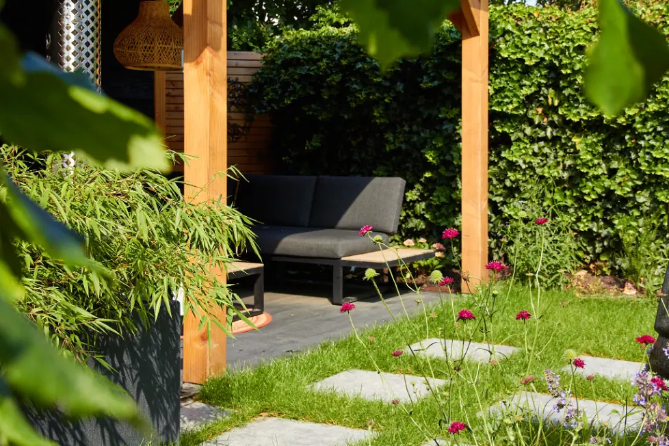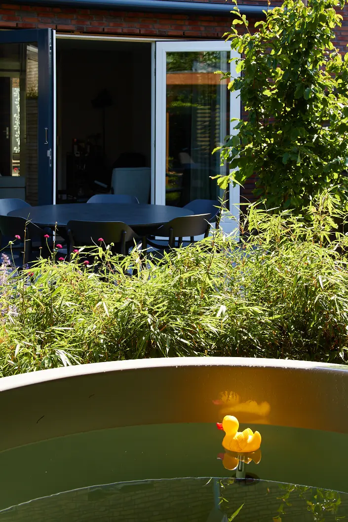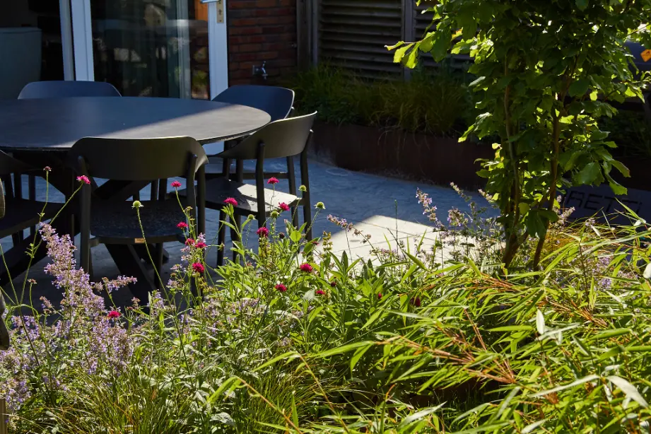 Daarna hebben we de aanleg en beplanting verzorgd. We plaatsten de houten overkapping met geïntegreerde buitenkeuken en werkten de terrassen en paden af met grote tegels en stapstenen door het gazon. De borders zijn gevuld met een rijke mix van siergrassen en bloeiende vaste planten in paarse en roze tinten, aangevuld met meerstammige bomen en bamboe voor hoogte, privacy en een groene sfeer.