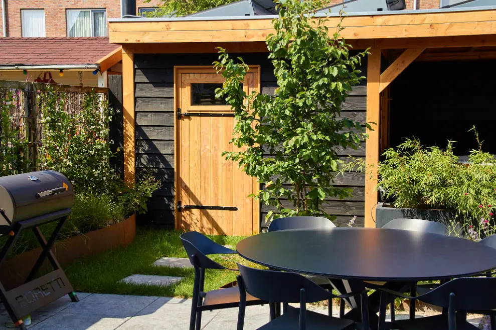 Voor deze tuin hebben we een ontwerp gemaakt met duidelijke leefzones: een ruim terras bij de woning, een beschutte loungeplek onder de overkapping en een centrale plek om te eten en buiten te koken. Strakke lijnen in de verharding en een warme houttoon in de constructies zorgen voor rust, terwijl de ronde vormen in de borders de tuin zachter en speelser maken.