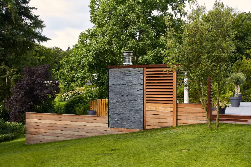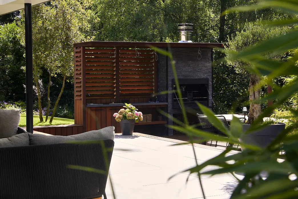 Daarna hebben we de aanleg verzorgd en de keukenconstructie geplaatst, inclusief werkblad, spoelgedeelte en geïntegreerde barbecue. Langs de randen en rondom de zitplekken is gekozen voor een groene, natuurlijke beplanting die aansluit op de omgeving en tegelijk beschutting en sfeer geeft, met siergrassen, vaste planten en robuuste heesters.