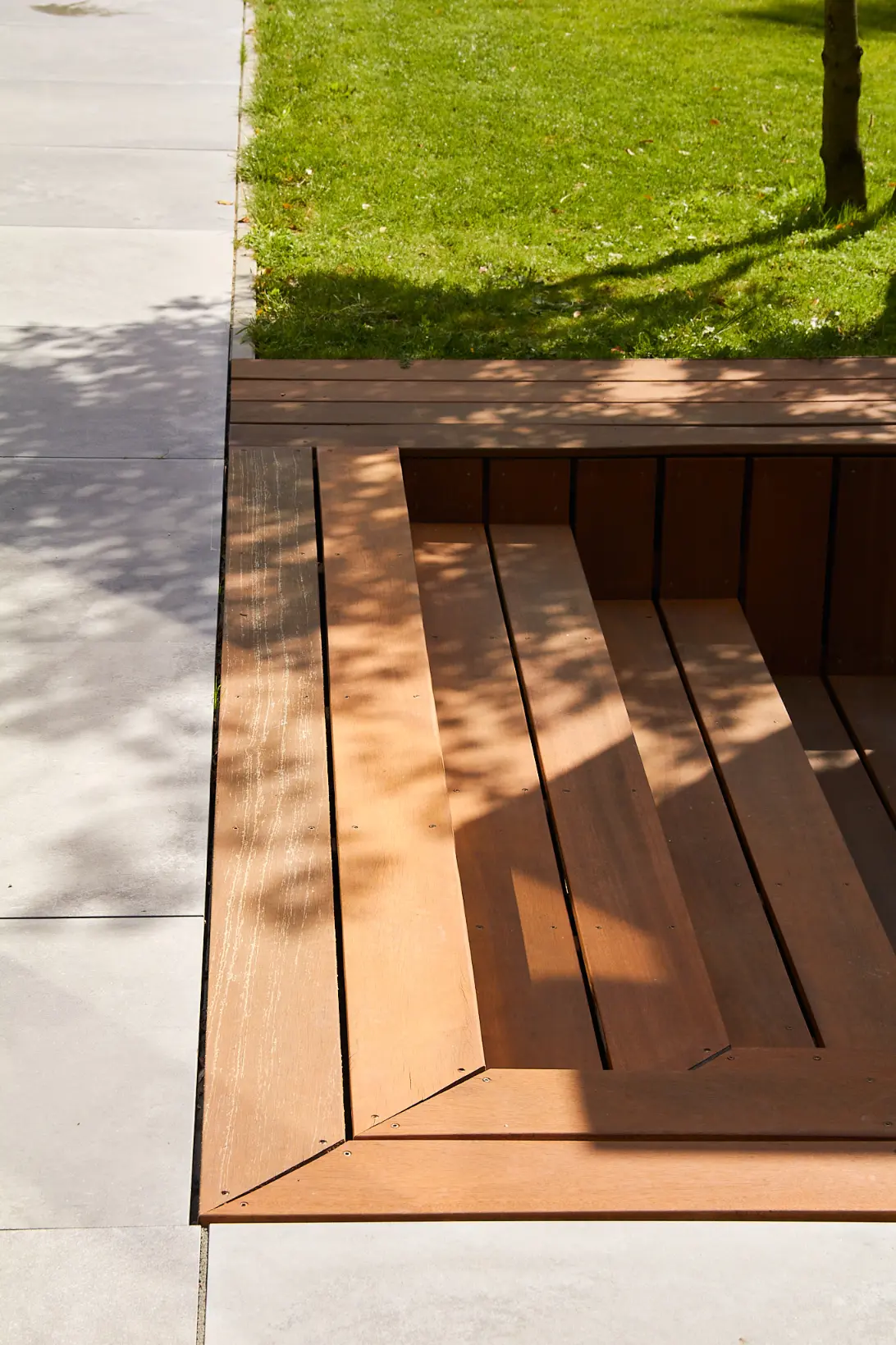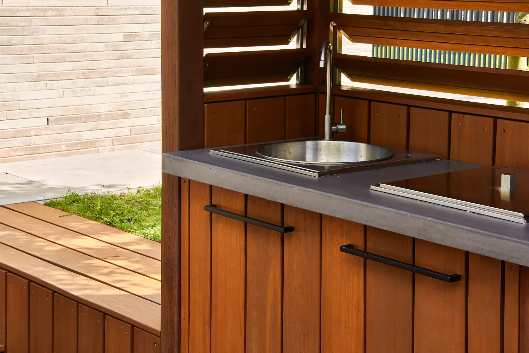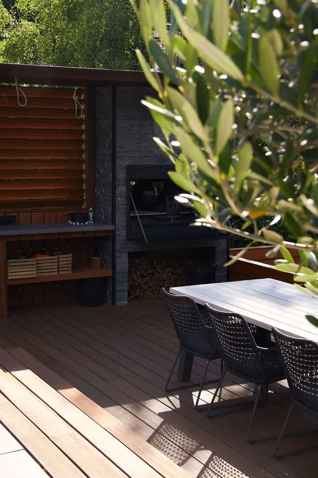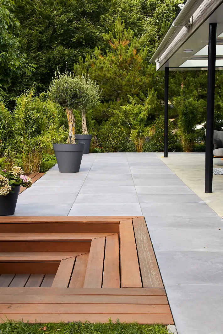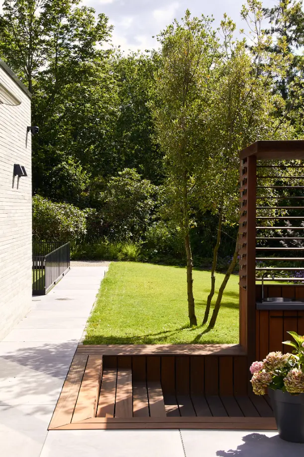 We hebben het ontwerp uitgewerkt rondom één duidelijke buitenkamer: een ruim terras met een op maat gemaakte buitenkeuken als blikvanger. Door te werken met hoogteverschillen, een verdiept zitgedeelte en een rustige materiaalbasis (hout, steen en grote tegels) ontstaat er structuur én een logische routing door de tuin.