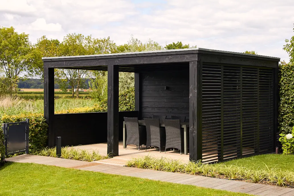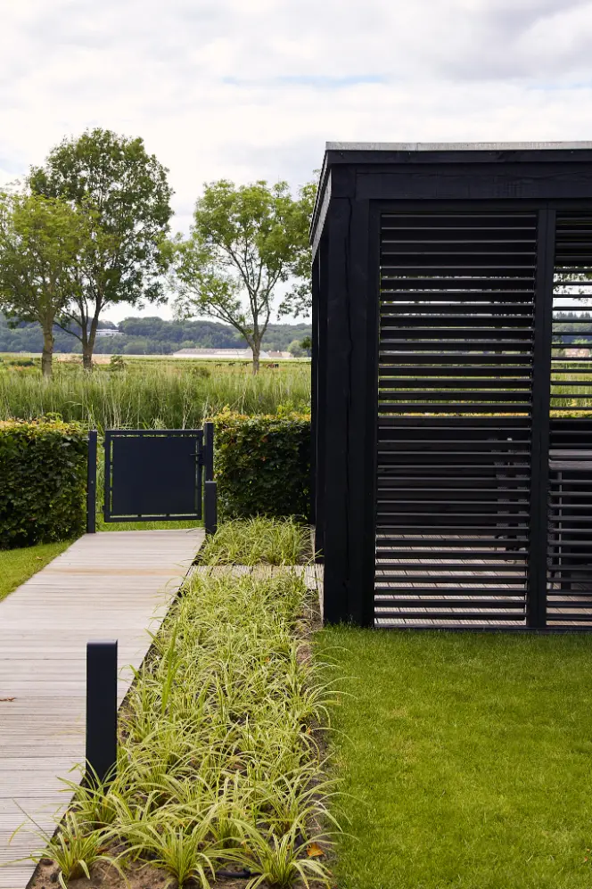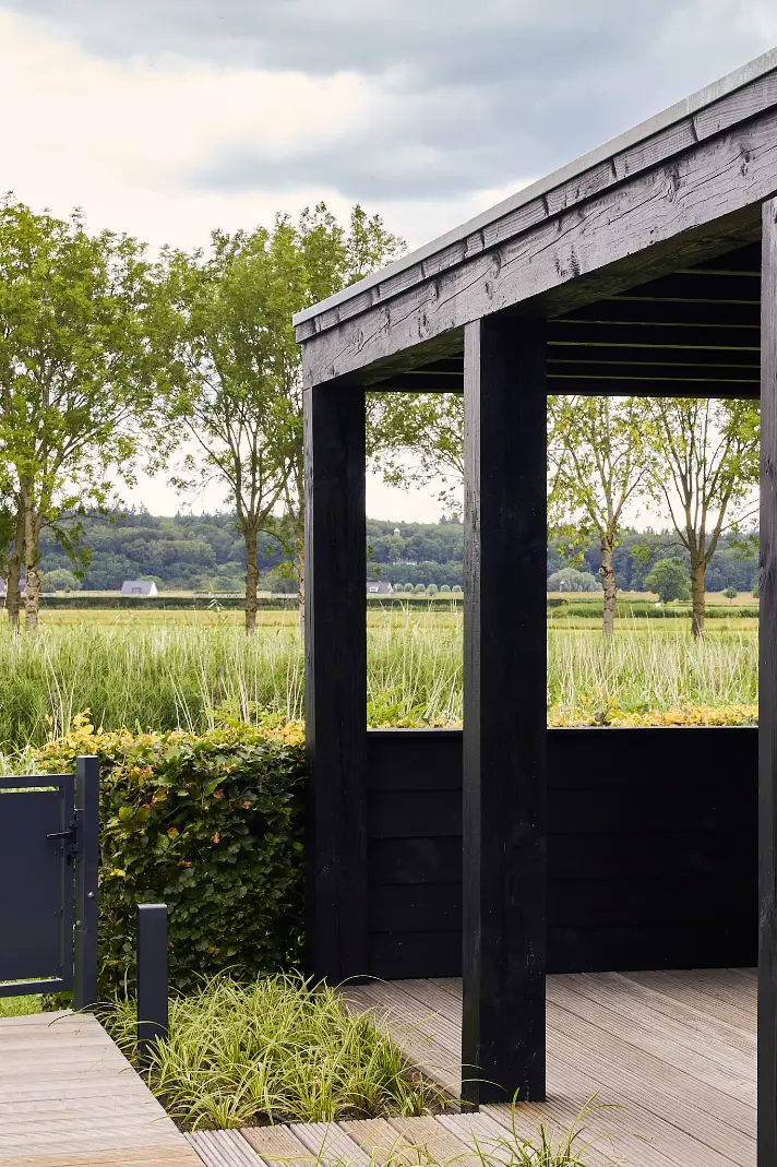 We maakten het ontwerp rondom de relatie met het water: een heldere lijnvoering, een open paviljoen en een vloer die visueel doorloopt richting de oever. De houten vlonder en het donkere houtwerk zorgen voor een krachtige, moderne basis die mooi wegvalt in het groen eromheen.