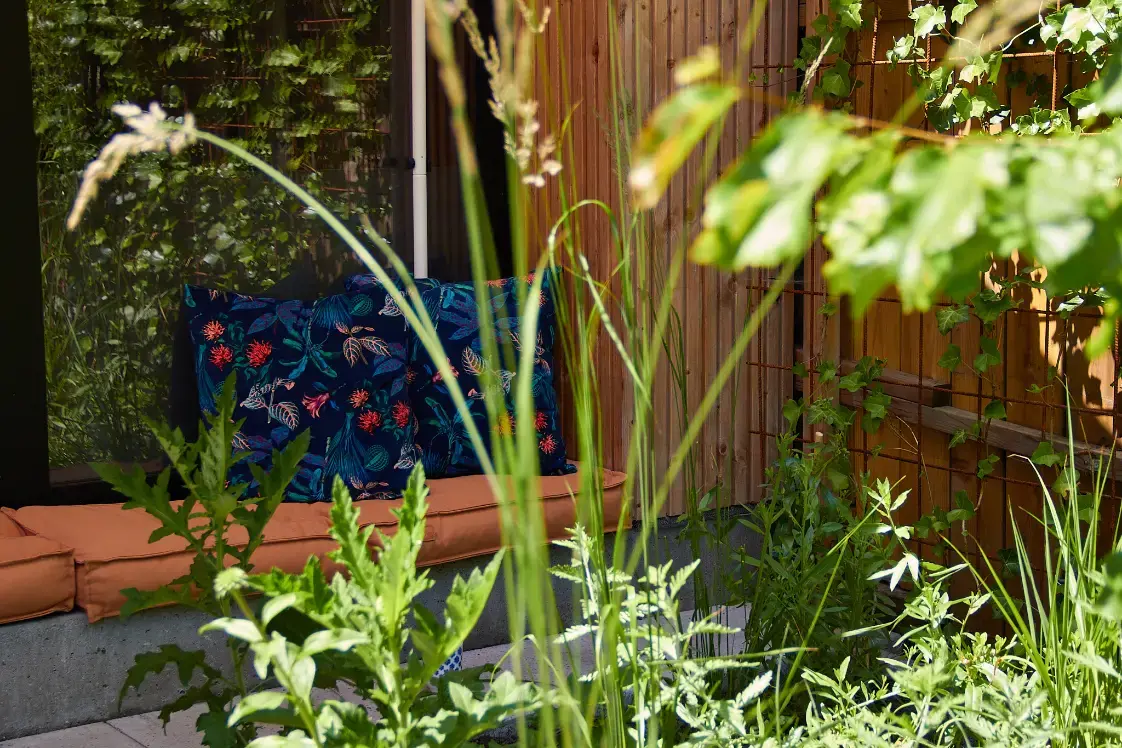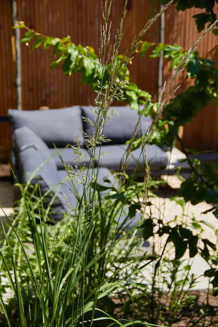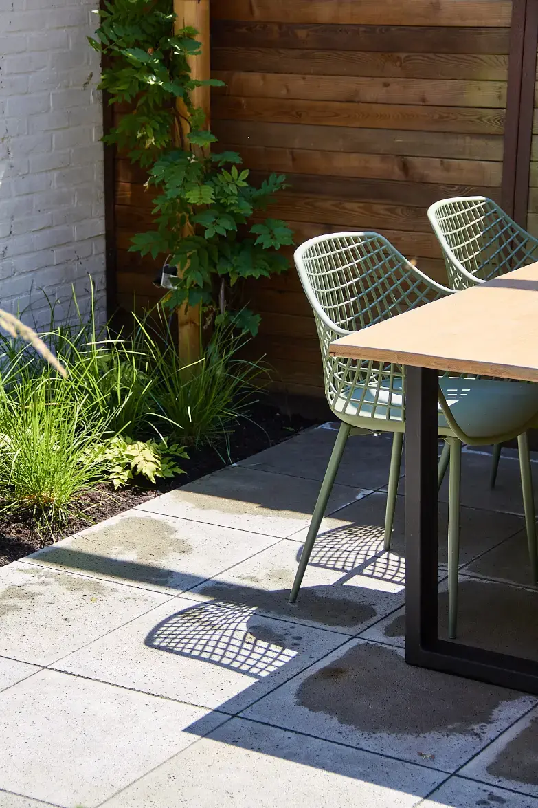 Bij de materiaalkeuze hebben we goed gekeken naar de nieuwe aanbouw van de woning. De bestrating en afwerking sluiten qua kleur en uitstraling precies aan, waardoor huis en tuin één geheel vormen. Tussen de strakke lijnen hebben we veel groen toegevoegd, zodat het terras een zachte, levendige sfeer krijgt en je echt het gevoel hebt in een groene stadstuin te zitten.