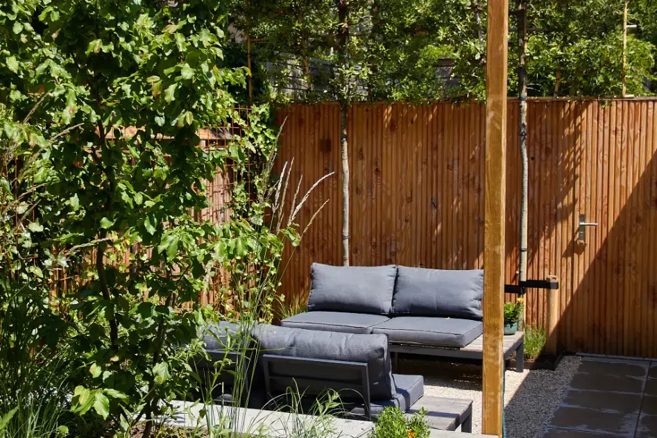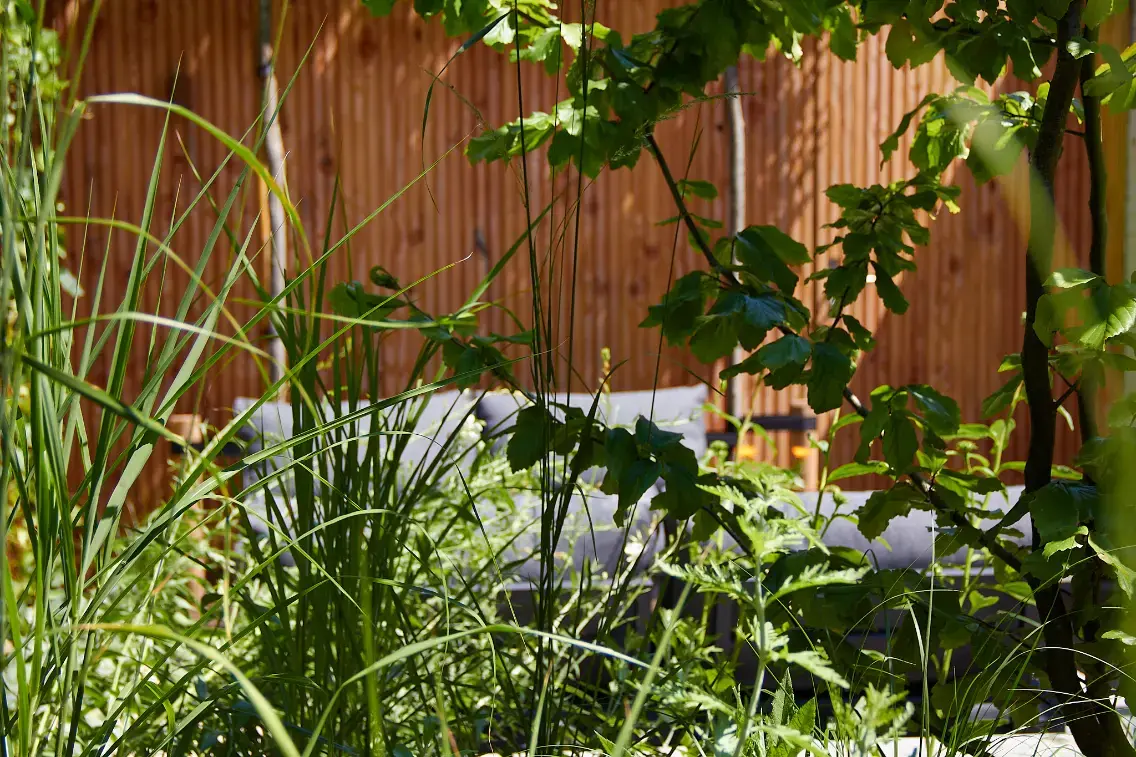 We hebben deze stadstuin ingericht als een groen terras met duidelijke niveaus. De grote trap van Schellevis traptredes vormt de verbinding tussen de verschillende hoogtes en maakt de tuin meteen overzichtelijk en toegankelijk. Rondom de trap hebben we ruime terrassen en kleine zitjes aangelegd, zodat je op meerdere plekken kunt zitten met zon of juist wat beschutting.
